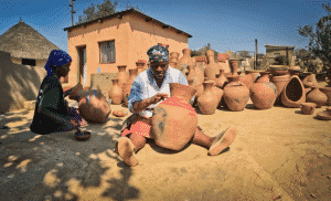 Heading along the dusty village roads, dodging chickens, cows and taxis, visitors arrive at Mukondeni Pot Village. Here, the Matriarch, Sarah Munyai, taught the women